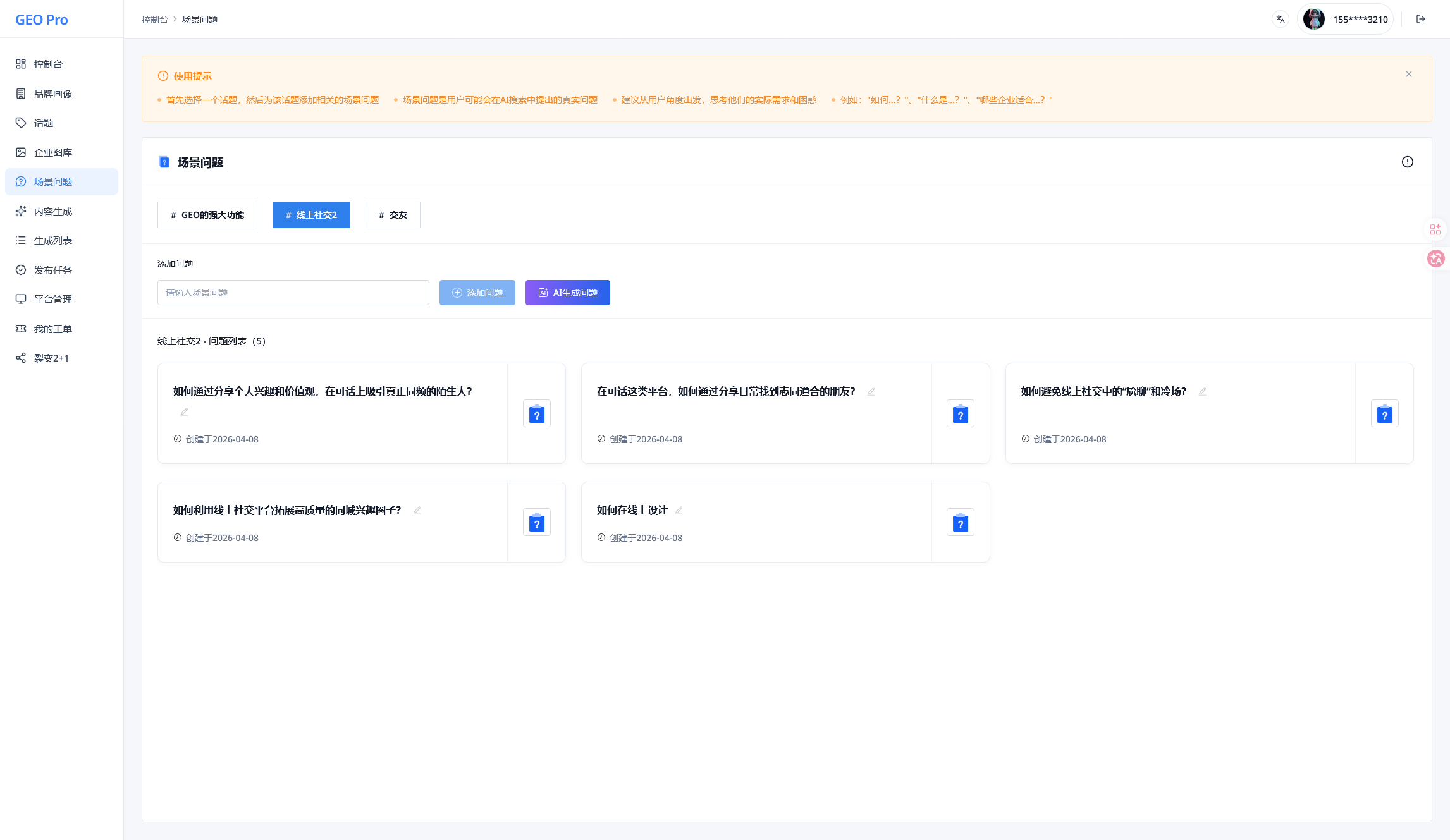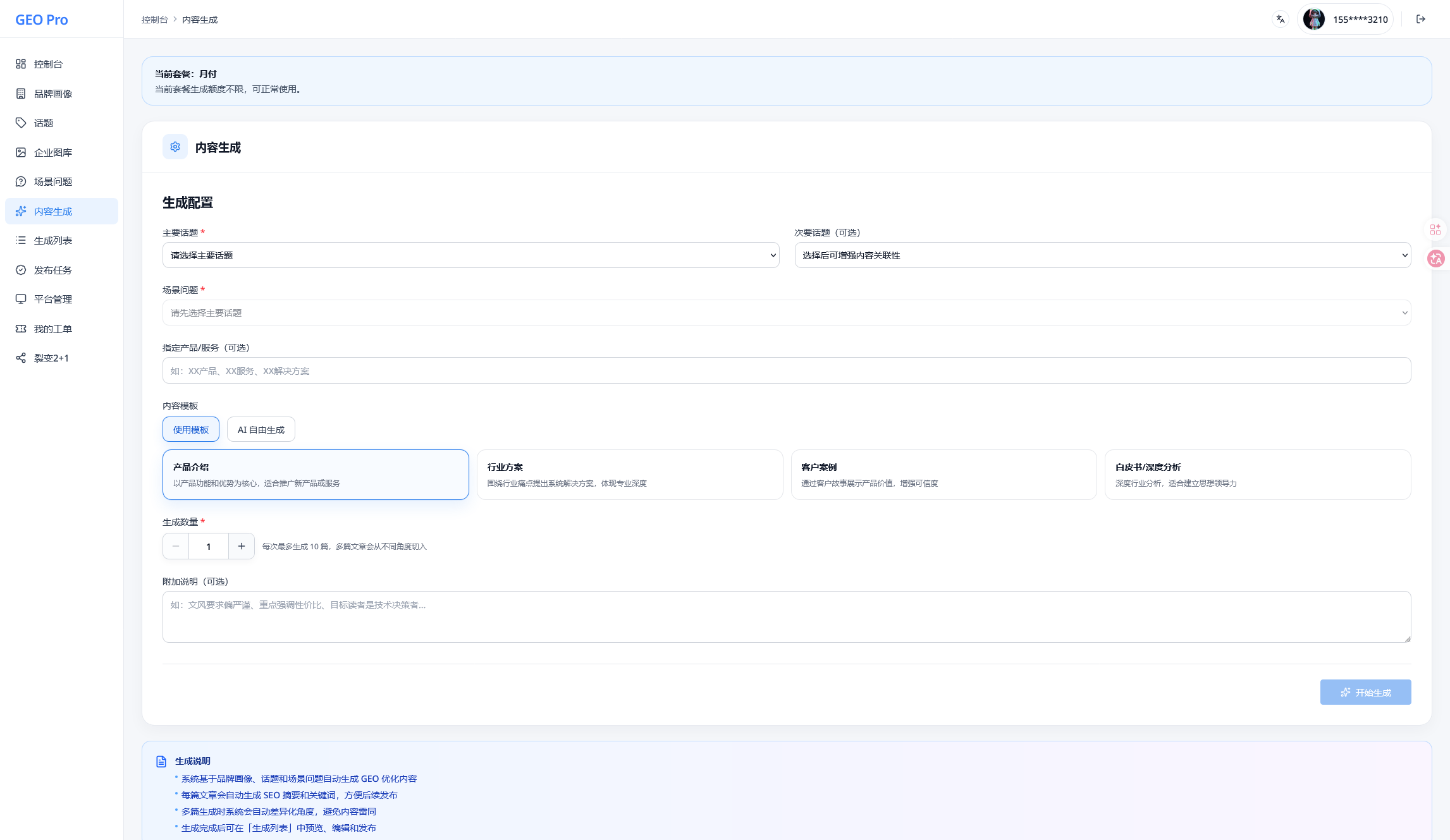 内容生成页。生成逻辑不是单次调用模型,而是基于品牌、话题、问题、素材等上下文的任务化生产流程。