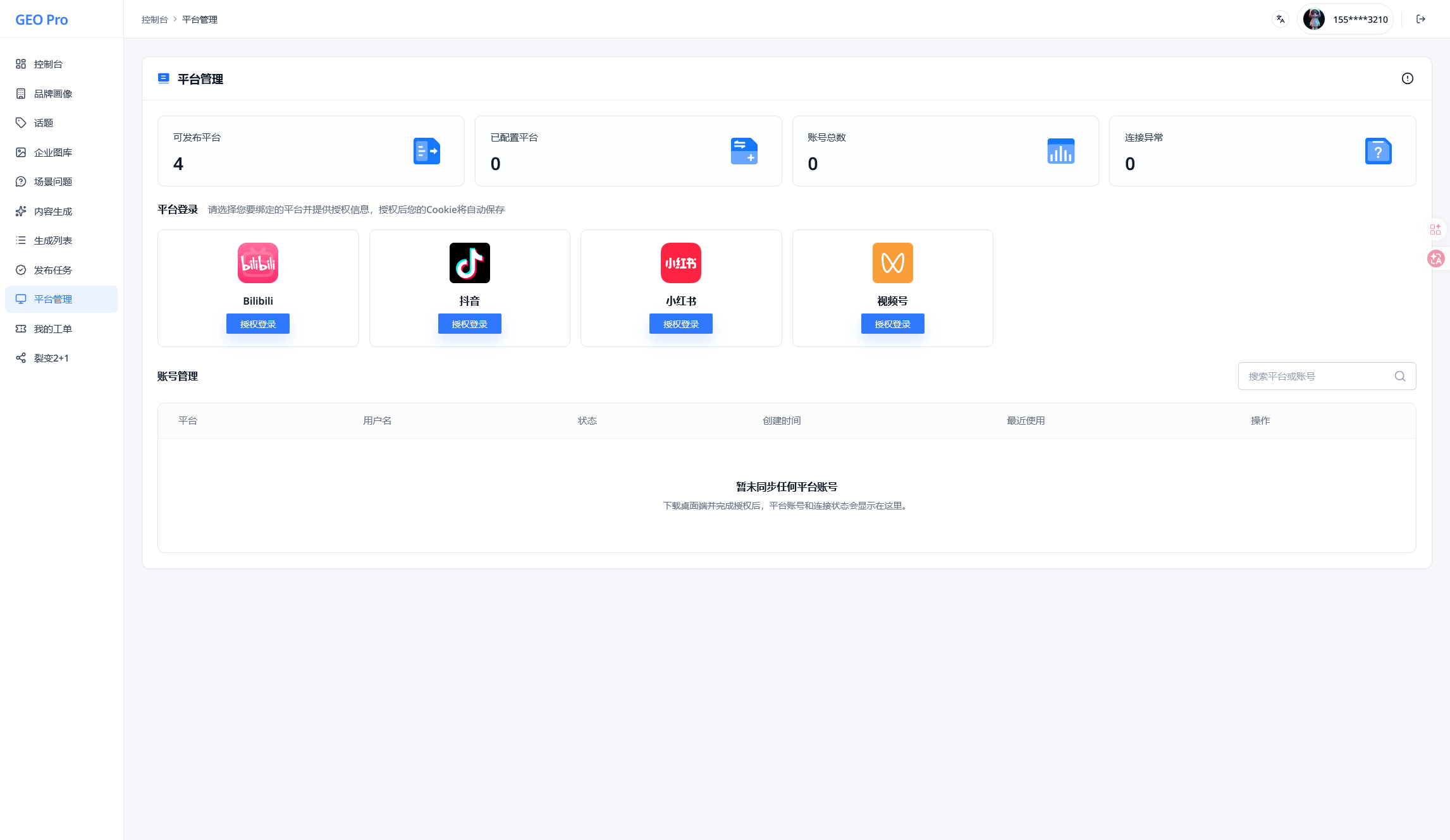 平台管理页。统一查看平台账号、授权状态、连接异常和最近使用情况。